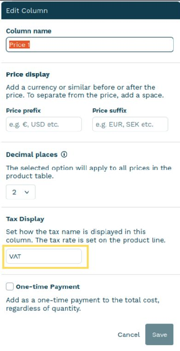 Use this setting to control the label shown for tax in the product table (for example, VAT).