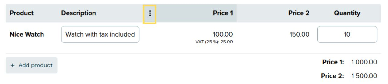 - In the product table, click the menu button in the Price 1 column.