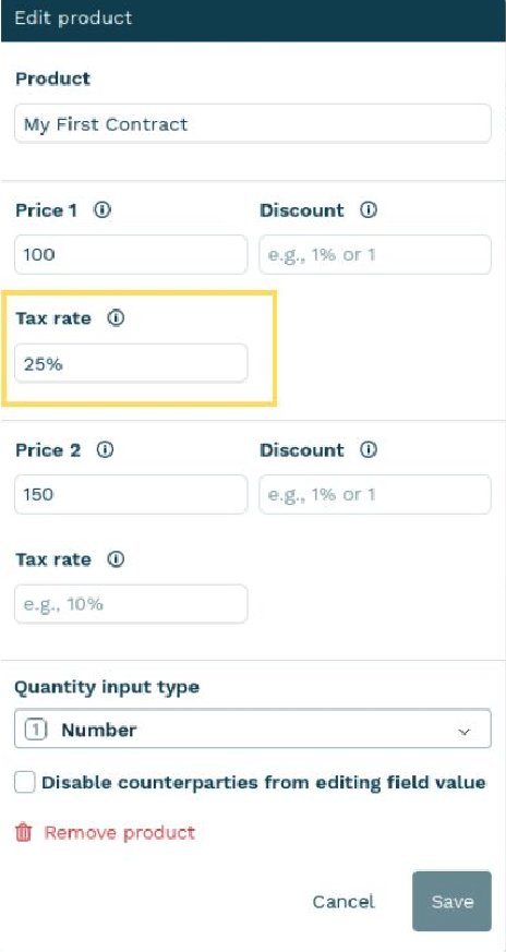 Note:When Oneflow calculates the total price and tax amounts, it follows the number of decimal places defined by the